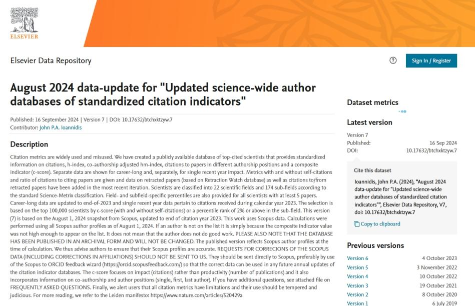 近日,美国斯坦福大学和Elsevier(爱思唯尔数据库)发布最新《2024年度全球前2%顶尖科学家榜单》,我校36名教师进入榜单,其中34位教师入选年度影响力榜单,12位教师入选生涯影响力榜单。全球前2%顶尖科学家榜单是Elsevier与斯坦福大学John P. A. Ioannidis教授团队合作的项目成果,发布在Elsevier旗下的Mendeley Data网站上。榜单基于Scopus数据库的引用数据系统分析,以被引数(区分自引和他引,提供自引数据)、H指数、HM...