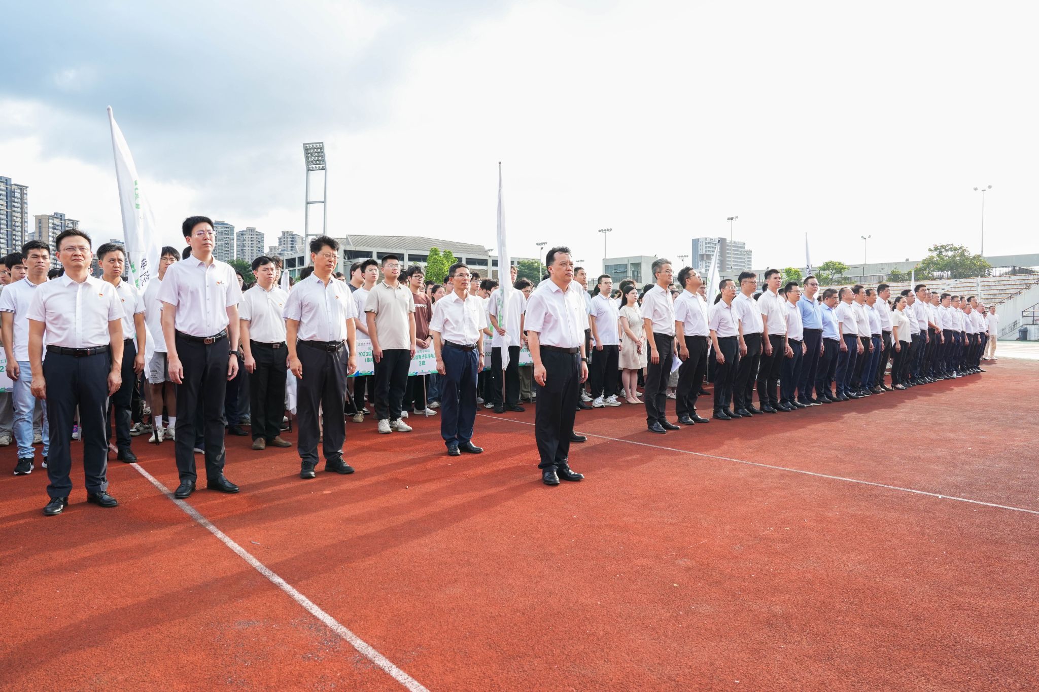 伴随着铿锵有力的步伐声,国旗护卫队护送着鲜艳的五星红旗走向旗杆。在全场人员肃穆的注视下,国旗徐徐升起,与朝阳一同在天空中展开,映衬出一片中国红。国歌的旋律激荡在每个人的心中,莞工师生以坚定信念向党的光辉成就献礼。