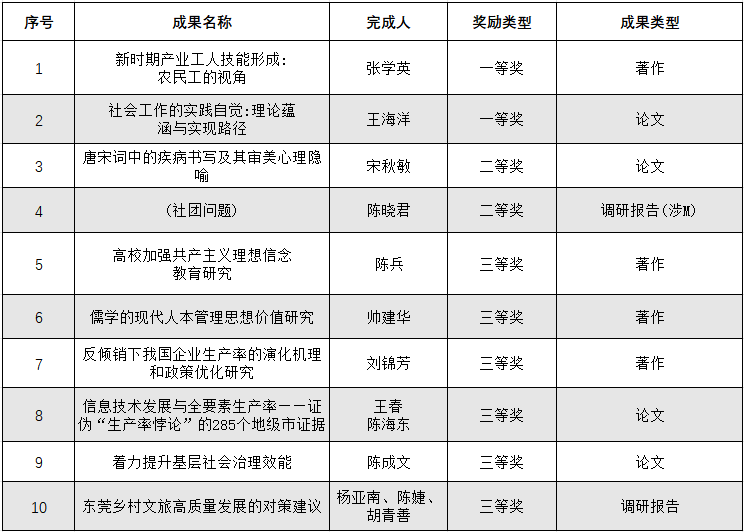 9月9日,东莞市第六届哲学社会科学优秀成果奖获奖名单正式公布,市政府批准授予获奖成果共21项,我校有10项,其中一等奖2项,二等奖2项,三等奖6项。张学英教授的著作成果和王海洋副教授的论文成果荣获一等奖,宋秋敏教授的论文成果和陈晓君老师的研究报告成果荣获二等奖,陈成文教授和陈兵老师等6项成果荣获三等奖。