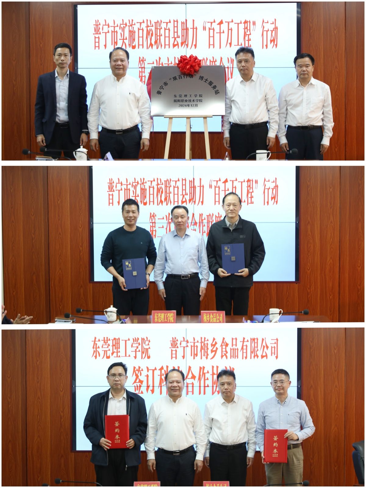 会上听取普宁市“双百行动”工作专班2024年度工作情况汇报和2025年度工作规划,举行了普宁市“双百行动”博士服务站揭牌仪式及聘任普宁市科技创新智库专家仪式,学校还与普宁市梅乡食品有限公司签订科技合作协议。与会领导为普宁市“双百行动”博士服务站揭牌,为两校专家颁发聘书。