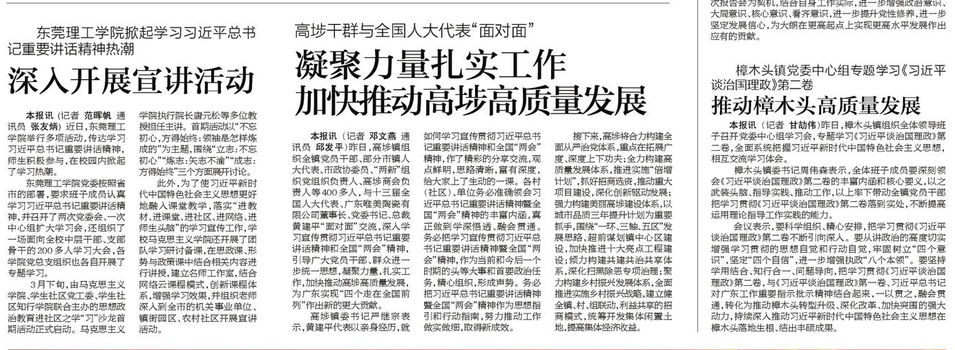 此外,为了使习近平新时代中国特色社会主义思想更好地融入课堂教学,落实“进教材、进课堂、进社区、进网络、进师生头脑”的学习宣传工作,学校马克思主义学院还开展了团队学习研讨备课,在思政课、形势与政策课中结合相关内容进行讲授,建立名师工作室,结合网络云课程模式,创新课程体系,增强学习效果,并组织老师深入到全市的机关事业单位、镇街园区、农村社区开展宣讲活动。