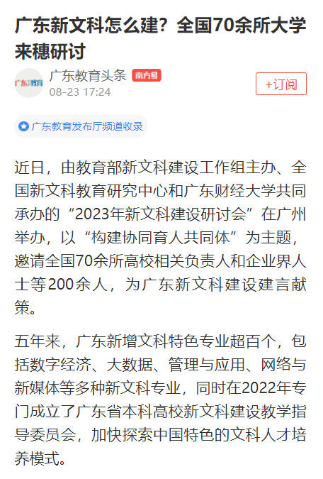 五年来,广东新增文科特色专业超百个,包括数字经济、大数据、管理与应用、网络与新媒体等多种新文科专业,同时在2022年专门成立了广东省本科高校新文科建设教学指导委员会,加快探索中国特色的文科人才培养模式。