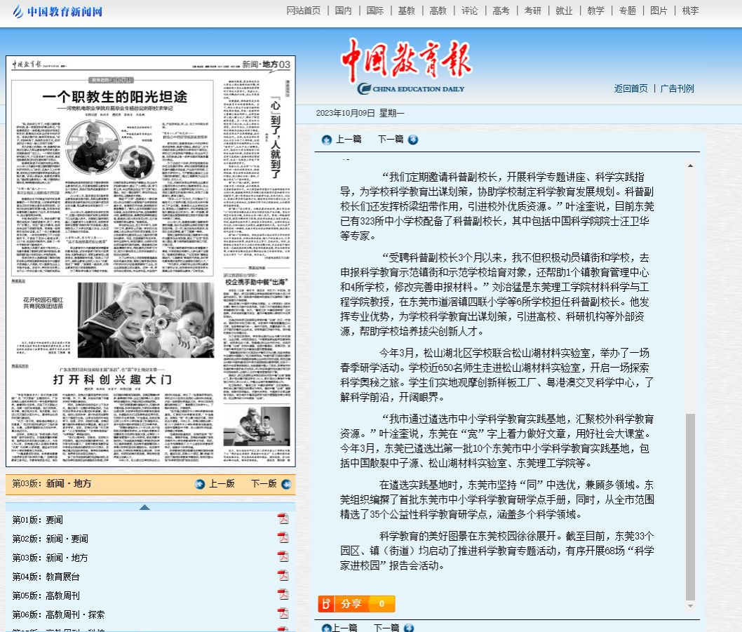 “我们定期邀请科普副校长,开展科学专题讲座、科学实践指导,为学校科学教育出谋划策,协助学校制定科学教育发展规划。科普副校长们还发挥桥梁纽带作用,引进校外优质资源。”叶淦奎说,目前东莞已有323所中小学校配备了科普副校长,其中包括中国科学院院士汪卫华等专家。