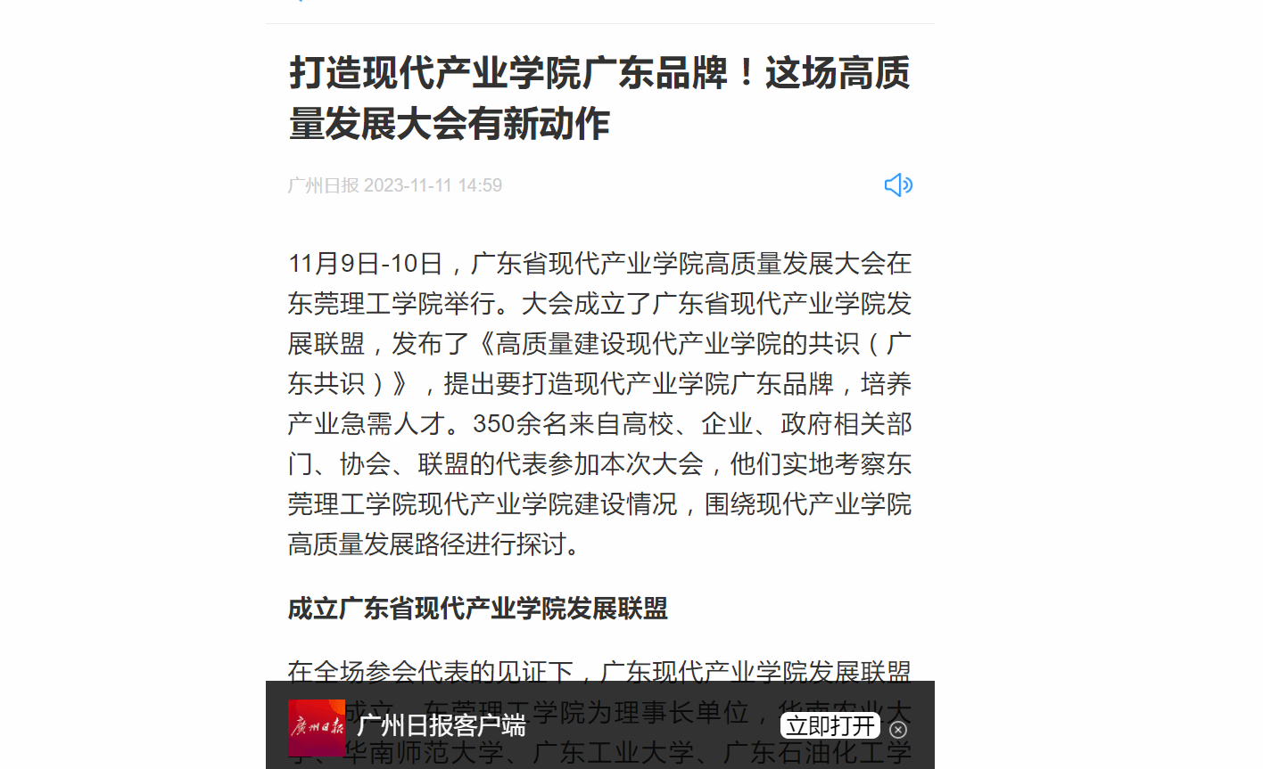 大会还发布了《高质量建设现代产业学院的共识(广东共识)》(以下简称《共识》),打造现代产业学院广东品牌。广东省教育厅副厅长冯伟表示,现代产业学院建设着力做好扩大产业学院协同合作、完善动态管理评价标准、强化政策资金配套支持等工作。他希望借助此次会议的研讨交流,各高校能够进一步深化对产业学院重要性的认识,将现代产业学院作为学校应用型人才培养的重要抓手和教育综合改革的突破口,持续深化产教融合协同育人,推动建好建强现代产业学院。
