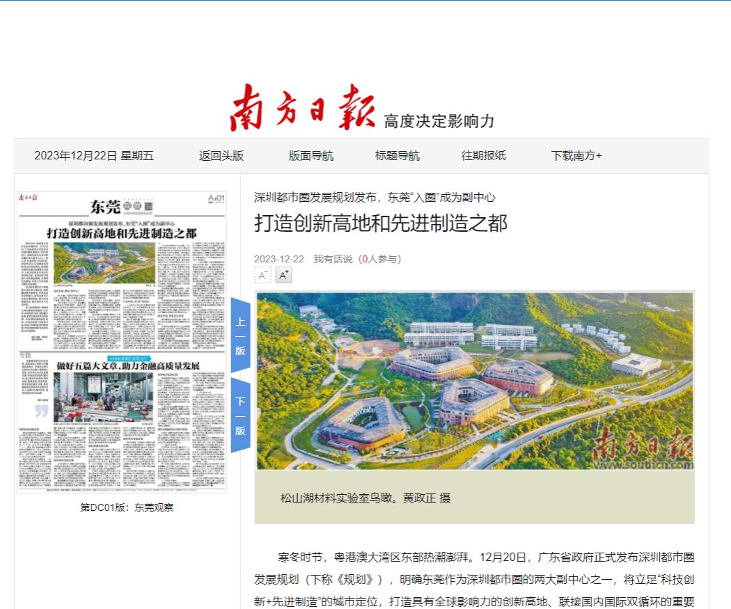 融入深圳都市圈,东莞向“新”而行,将为自身带来难得的发展空间。《规划》提出,以深圳为主阵地建设大湾区综合性国家科学中心。东莞松山湖作为大湾区综合性国家科学中心先行启动区,原始创新能力也将进一步增强。松山湖科学城将驶入“快车道”,滨海湾新区、水乡新城、银瓶合作创新区等创新平台也将加强协同发展,散裂中子源二期、先进阿秒激光等大科学装置即将启动建设。松山湖材料实验室也将加入都市圈高水平实验室集群,进一步提升多学科交叉前沿研究“内功”,强化都市圈原始创新能力。