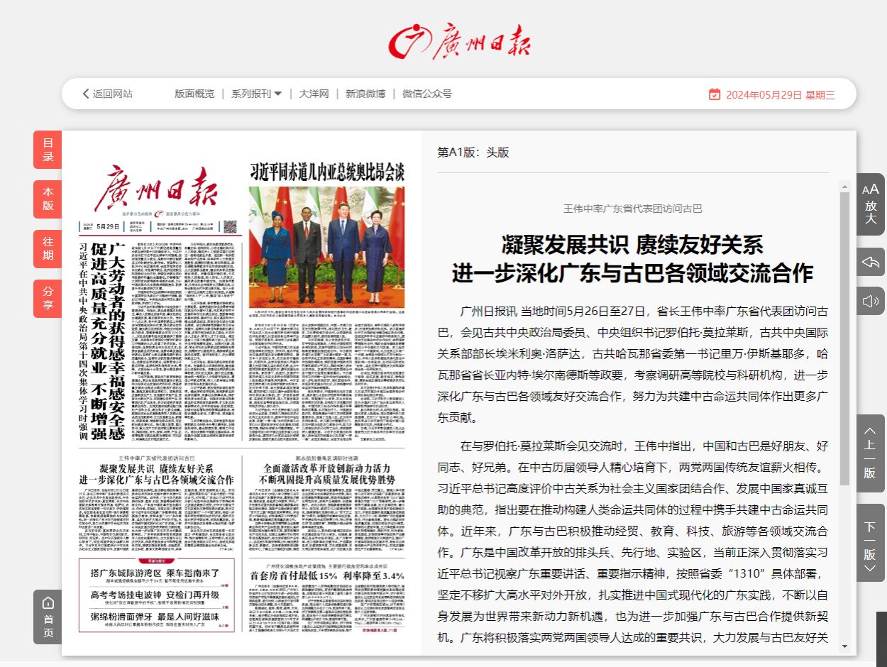 当地时间5月26日至27日,省长王伟中率广东省代表团访问古巴,会见古共中央政治局委员、中央组织书记罗伯托·莫拉莱斯,古共中央国际关系部部长埃米利奥·洛萨达,古共哈瓦那省委第一书记里万·伊斯基耶多,哈瓦那省省长亚内特·埃尔南德斯等政要,考察调研高等院校与科研机构,进一步深化广东与古巴各领域友好交流合作,努力为共建中古命运共同体作出更多广东贡献。