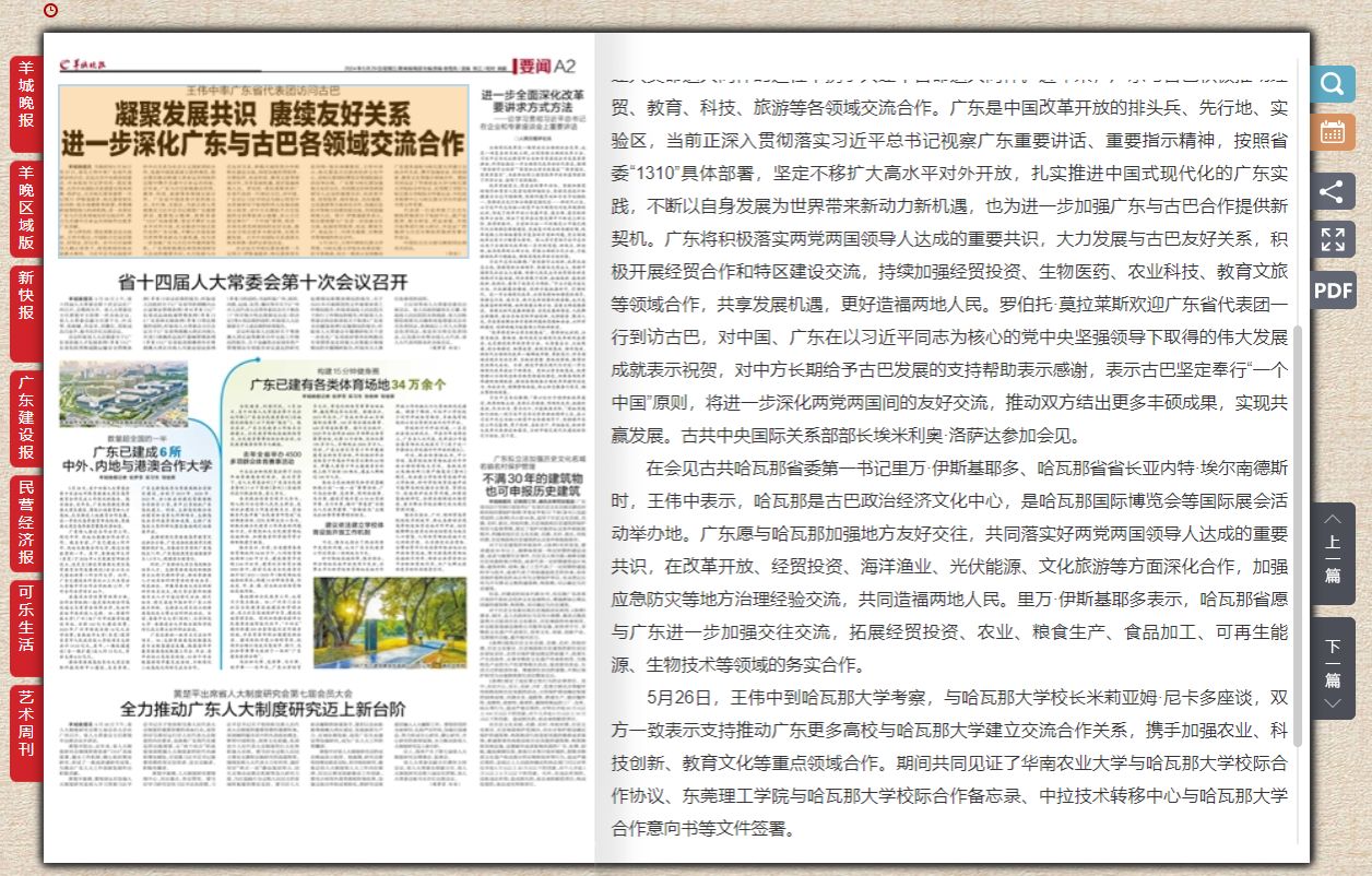 当地时间5月26日至27日,省长王伟中率广东省代表团访问古巴,会见古共中央政治局委员、中央组织书记罗伯托·莫拉莱斯,古共中央国际关系部部长埃米利奥·洛萨达,古共哈瓦那省委第一书记里万·伊斯基耶多,哈瓦那省省长亚内特·埃尔南德斯等政要,考察调研高等院校与科研机构,进一步深化广东与古巴各领域友好交流合作,努力为共建中古命运共同体作出更多广东贡献。