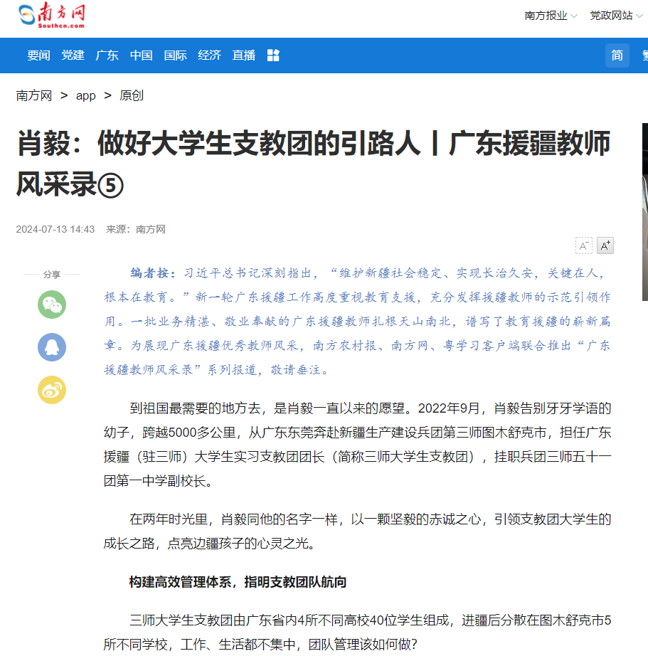 到祖国最需要的地方去,是肖毅一直以来的愿望。2022年9月,肖毅告别牙牙学语的幼子,跨越5000多公里,从广东东莞奔赴新疆生产建设兵团第三师图木舒克市,担任广东援疆(驻三师)大学生实习支教团团长(简称三师大学生支教团),挂职兵团三师五十一团第一中学副校长。