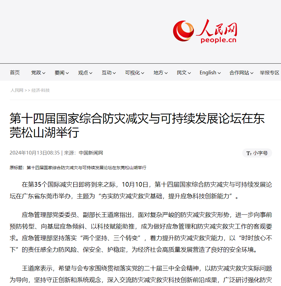 在第35个国际减灾日即将到来之际,10月10日,第十四届国家综合防灾减灾与可持续发展论坛在广东省东莞市举办,主题为“夯实防灾减灾救灾基础,提升应急科技创新能力”。