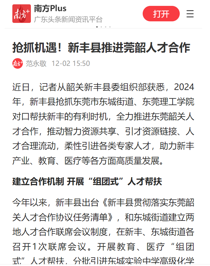 今年以来,新丰县出台《新丰县贯彻落实东莞韶关人才合作协议任务清单》,和东城街道建立两地人才合作联席会议制度,在新丰、东城街道各召开1次联席会议。开展教育、医疗“组团式”人才帮扶,分批引进东城实验中学高级化学教师刘健等30名骨干教师到新丰县为期一年帮扶任教,依托2个“莞韶支教名师工作坊”开展150多次传帮带活动,辅导新丰教师300人次,同时选派14名教师到东城街道跟岗学习,有效帮助提升新丰教育教学水平。