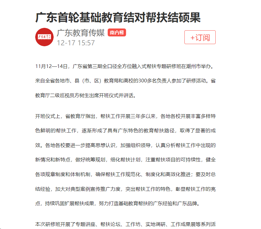 据了解,广东已举办了三期全口径全方位融入式帮扶专题研修班,分别在华南师范大学、岭南师范学院和韩山师范学院举办。2025年是首轮结对帮扶目标任务的收官之年,将在嘉应学院举办第四期研修班。