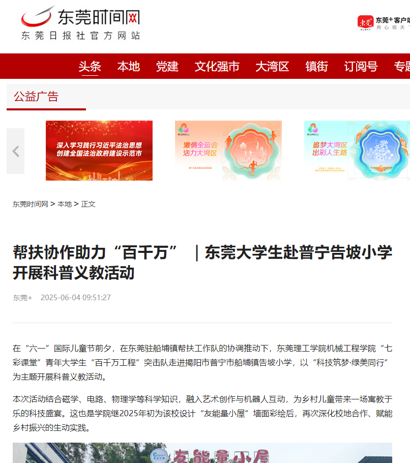 本次义教活动是机械工程学院扎根揭阳普宁市的一个生动缩影。自2023年团省委实施广东青年大学生“百千万工程”突击队专项行动以来,学院已组建20余支突击队,其中5支深度服务普宁船埔镇,积极投身校地共建项目。在“红色南阳山”实践基地建设规划、特色农产品包装设计、农作物生长智慧检测、科普义教等方面成绩突出。相关突击队参与的项目落地后,为当地强村公司创造营业额约120万元,实现净利润约40万元。学生在项目实践中积累的成果也有力反哺教学科研,学院本科生从智慧农业项目中孵化出3篇SCI论文,真正将论文写在了祖国大地上。