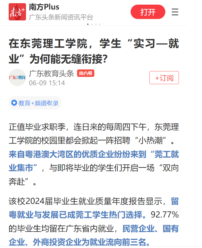 该校2024届毕业生就业质量年度报告显示,留粤就业与发展已成莞工学生热门选择。92.77%的毕业生均留在广东省内就业,民营企业、国有企业、外商投资企业为就业流向前三名。