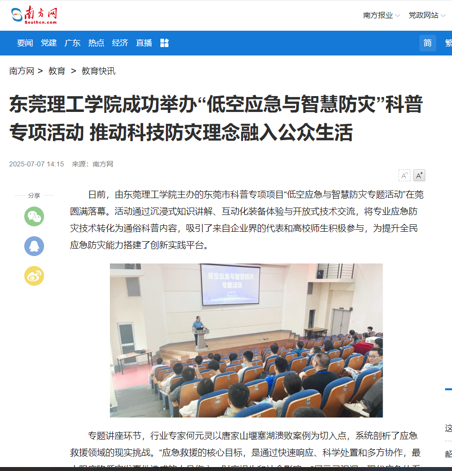 作为东莞市科普专项项目的重要实践,本次活动创新采用“技术科普化、科普场景化、场景实用化”的设计理念,推动低空应急与智慧防灾技术走出实验室,以可触摸、可体验、可操作的方式融入公众认知。活动相关负责人表示,未来将持续深化科普创新,为构建“全民参与、科技赋能”的现代化防灾减灾体系贡献高校力量。