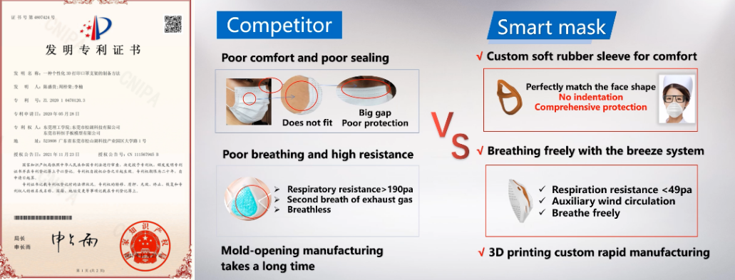 目前项目成果已获得广东省机械工业科学技术奖二等奖及广东省机械工程学会科学技术奖二等奖,相关的产品已获得一类医疗器械备案,申请中国发明专利6项(授权2项)、美国发明专利1项、南非发明专利1项,《一种个性化3D打印口罩支架的制备方法》的中国发明专利获第九届澳门国际创新发明展金奖;项目组牵头制定了团体标准并引导推动市场发展,项目形成的成果多次受到新闻媒体报道,取得了良好的社会效益。