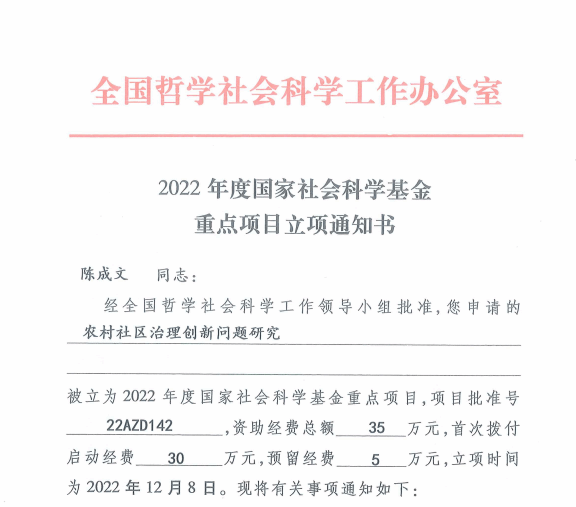 根据全国哲学社会科学工作办公室通知,法律与社会工作学院(知识产权学院)陈成文教授为首席专家申报的“农村社区治理创新问题研究”项目(批准号:22AZD142)获批国家社科基金“重大转重点”项目,是我校首个“重大转重点”项目。该项目以结构-功能与制度-行动为理论视角,坚持社区治理表层结构与深层结构的功能分析与模式分析相结合、社区治理正式制度与非正式制度分析相结合、治理显功能与潜功能、正式行动与非正式行动分析相结合,在分析农村社区治理创新的组织体系、下沉体制、运行机制和数字化技术之间的关系机理的基础上,揭示乡村治理的基本逻辑和一般规律,为解释有中国特色的农村社区治理创新之路提供理论与实证支撑。