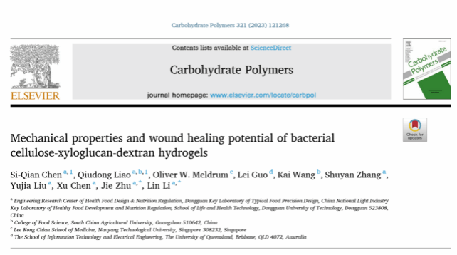 近日,我校生命健康技术学院、食品营养健康工程与智能化加工研究中心生物大分子构效与营养品质调控团队在国际化学顶级期刊《Carbohydrate Polymers》发表了题为“Mechanical properties and wound healing potential of bacterial cellulose-xyloglucan-dextran hydrogels”的研究论文。陈思谦副教授为论文的第一作者,朱杰教授、李琳教授为通讯作者。