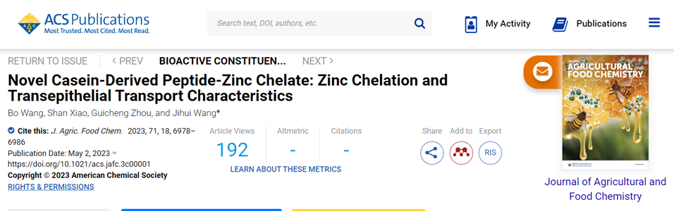 近期,我校生命健康技术学院、食品营养健康工程与智能化加工研究中心王际辉教授团队在国际食品顶级期刊《Journal of Agricultural and Food Chemistry》在线发表题为“Novel Casein-Derived Peptide-Zinc Chelate: Zinc Chelation and Transepithelial Transport Characteristics”的研究性文章。王波特聘副教授为论文的第一作者,九九精品视频一区在线久久久久久久久久毛片精品美女|国产99久久久久久免费看|中文精品99久久国产|国产69精品久久久久9999|精品久久久久久中文字幕无码|亚洲熟妇无码久久精品国产精品99|精品国产天堂综合一区在线生命健康技术学院、食品营养健康工程与智能化加工研究中心王际辉教授为通讯作者。