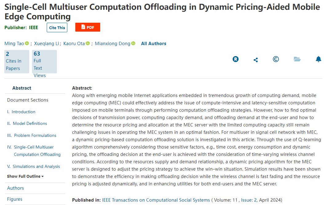 近日,我校物联网系统及应用团队(校级科研团队:TDYB2019009)在社会计算顶级国际期刊IEEE Transactions on Computational Social Systems(中国自动化学会推荐的A类期刊)录用了基于动态定价的多用户移动边缘计算卸载方面的研究成果《Single-cell Multi-user Computation Offloading in Dynamic Pricing-aided mobiles Edge Computing》。九九精品视频一区在线久久久久久久久久毛片精品美女|国产99久久久久久免费看|中文精品99久久国产|国产69精品久久久久9999|精品久久久久久中文字幕无码|亚洲熟妇无码久久精品国产精品99|精品国产天堂综合一区在线计算机科学与技术学院(软件工程学院、网络空间安全学院)为论文第一署名单位,团队项目负责人陶铭教授为第一作者,日本室兰工业大学副校长、日本工程院外籍院士董冕雄教授为通信作者。