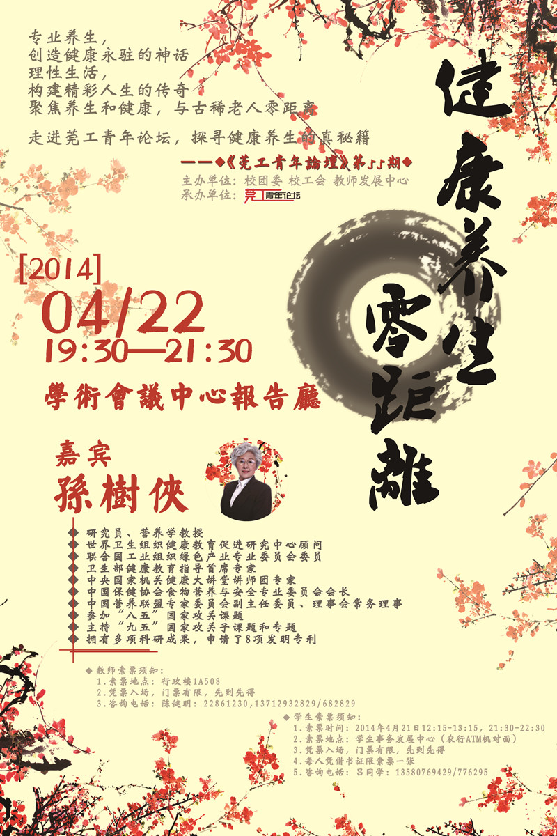 时 间:2014年4月22号(周二)晚上7:30 地 点:松山湖校区学术会议中心报告厅 主 题:健康养生零距离 嘉 宾:孙树侠 嘉宾简介: 孙树侠,研究员、营养学教授。世界卫生组织健康教育促进研究中心顾问,联合国工业组织绿色产业专业委员会委员。中国营养联盟专家委员会副主任委员、理事会常务理事,中央国家机关健康大讲堂讲师团专家,卫生部健康教育指导首席专家,中国保健协会食物营养与安全专业委员会会长。主持“九五”国家攻关子课题和专题,参加“八五”国家攻关课题,拥有多项科研成果,申请了8项发明专利。