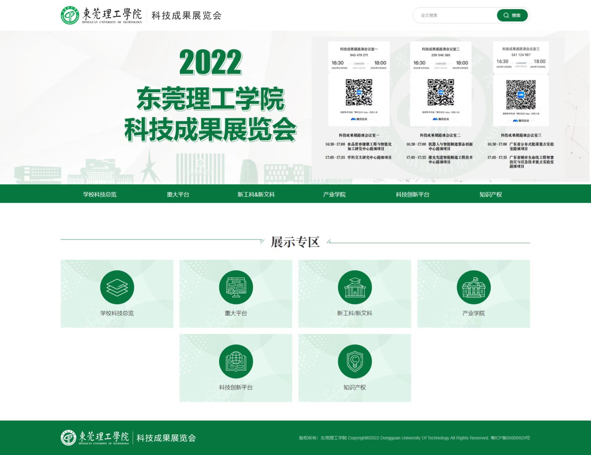 线上展览则划分了学校科技总览、重大平台、新工科&新文科、产业学院、科技创新平台及知识产权六个专区,共有9个重大平台,12个二级学院,6个产业学院及5个科技创新平台展示了其产出的科技成果。展览网址是https://kjz.dgut.ddssm.com/。