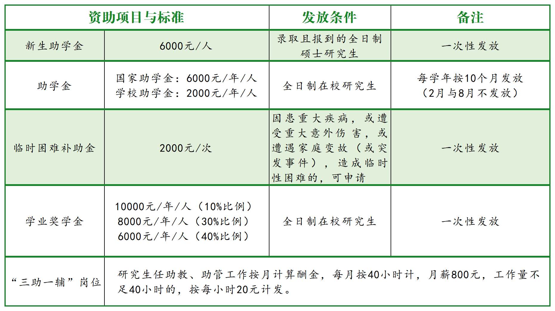 学校依托地区经济发展优势,加大经费投入力度,努力为研究生创造较好的学习条件。主要奖(助)学金如表所示。