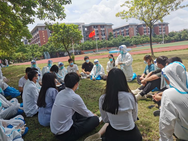 在操场,临时党支部组织了一场“信仰的力量”主题党课,邀请广州新华学院的学生党员代表参与,一起交流疫情防控期间的所思所悟。在谈到面对疫情时,学生党员代表表达了自己对信仰的理解。“在最艰难的那段日子里,是信仰的力量在支撑,正是这股力量,让面对黑暗的我们,背后有了光。”一名学生党员动情地说。“作为党员,在学校因疫情而封控的至暗时刻,特别想冲到前线参与抗疫工作,为学校为同学们贡献力量,可惜的是自己也在隔离,无法实现心愿。”另一名学生党员说出了同学们的共同心声,语气中带着满满遗憾。学生党员代表向前来支援疫情防控的莞工支援队表示衷心的感谢和崇高的敬意。