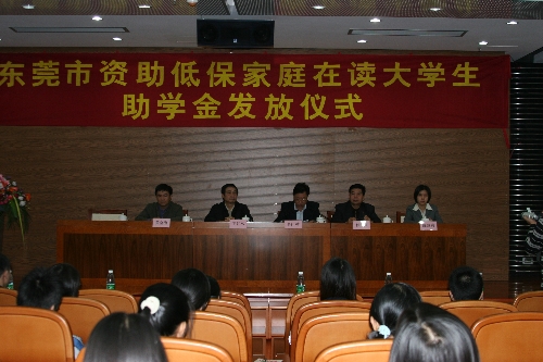 东莞市资助低保家庭在读大学生助学金发放仪式于上周四举行。学院临时党委副书记王江水同志,东莞市人民政府副秘书长梁冰,东莞市民政局局长杜度,东莞市教育局副局长黄金海,团市委副书记陈慧贞等出席了发放仪式。