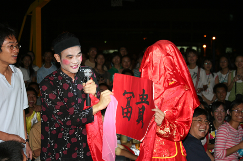 一位大娘带着她的女儿来到新生当中,在扎堆的大好青年当中要找出一位称心如意的女婿着实让她颇费周折。互动喜剧《相亲》将整场演出推上了高潮