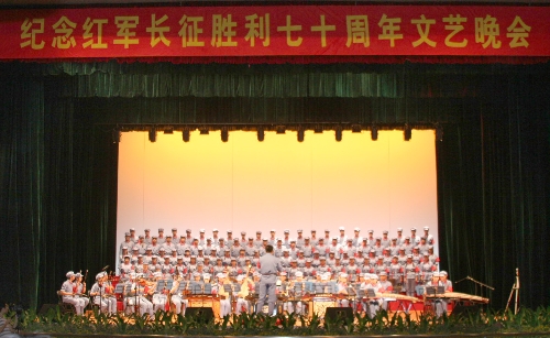 我院纪念长征胜利七十周年文艺晚会昨晚在大礼堂隆重举行,百余师生同台演唱了经典革命歌曲《长征组歌》。 东莞市委副书记兼我院党委书记刘树基,东莞市委常委、宣传部部长江凌,我院院长杨晓西、党委副书记王江水和副院长邹晓平等观看了演出。