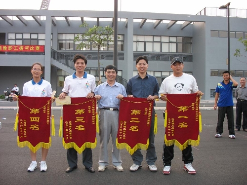 学院工会组织的教工拔河比赛昨日结束, 经过四轮激烈的角逐,体育系勇拔头筹,后勤集团获得第二名,院机关获得第三名,电子工程系得第四名。院党委副书记、工会主席王江水到现场为获得前四名的队伍颁奖。