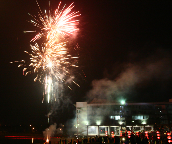 在迎春酒会上,参加酒会的领导嘉宾一同举杯,恭祝全院教职工、老干部、老同志新春快乐,生活幸福。杨晓西院长在祝酒辞中,代表学院向所有光临团拜会的领导和嘉宾表示热烈的欢迎,向全院教职员工一年来的辛劳和奉献表示衷心的感谢。他回顾了2006年学院在教学工作、人才引进、和谐校园建设、科学研究和校园文化建设、协办第七届大运会、迎接学士学位授予单位评审等各方面取得的累累硕果,希望全院师生员工继续团结一致,求真务实,打好“迎评促建”攻坚战,为建设具有创新特色的名牌地方院校而努力。酒会上,还燃放了焰火,在空中盛放的焰火与人们脸上洋溢着的喜悦构成了一幅暖意浓浓的“迎春图”,不少老师举起手中的相机,留住这美丽的一刻。