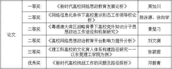 近日,广东学工公布了2019年广东高校思想政治工作论文征集活动获奖名单,我校选送的6篇论文均荣获奖项,其中一等奖1项,二等奖3项、三等奖1项,优秀奖1项。
