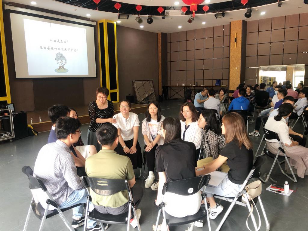 范兆兰博士为大家带来了一场别开生面的心理释压课程。她运用积极心理学,通过体验式团体活动模式,在游戏互动的过程中帮助辅导员们科学释放压力,引导大家学会积极对待生活和工作,现场老师表示:“辅导员的工作千头万绪,精神时刻处于一个紧绷的状态,只有先放松下来,才能清空自己,全身心投入到工作和学习中去。”