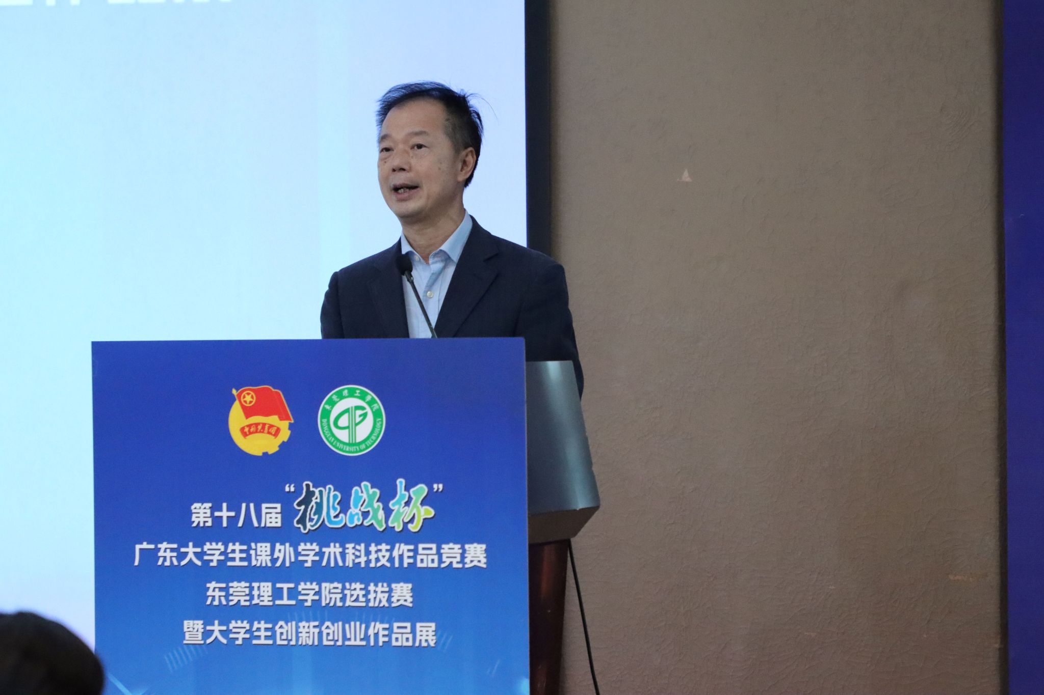 李忠红向进入选拔赛的52个师生团队表示热烈的祝贺,向为我校创新创业工作给予指导支持的业界专家们表示衷心的感谢。他强调,学校一直以来围绕粤港澳大湾区、东莞产业发展重大需求,与多方资源合作对接,搭建实践教学、科研攻关、成果转化、创新创业等平台,切实提升学生实践能力和创新思维,希望青年师生要把握历史机遇、勇担时代重任,以今天科技创新的小探索为起点,努力成就明天创新创造的大成果,为实现中华民族伟大复兴的中国梦贡献当代大学生的智慧和力量!