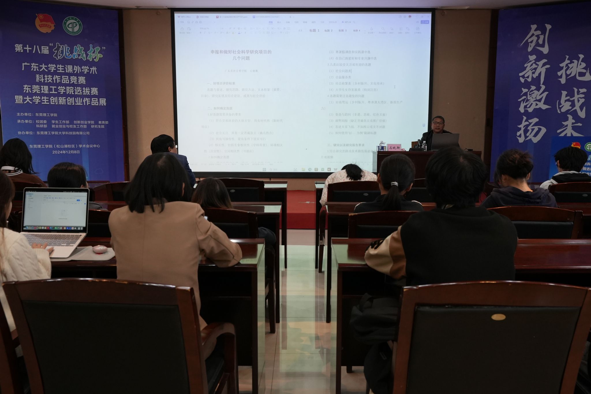 当天下午,组委会邀请广东省社会科学院社会学与人口学研究所所长左晓斯在学术会议中心以《申报和做好社会科学研究的几个问题》为题,与在场参赛人员开展了一场学术讲座。讲座从好项目的评价标准出发,引导参赛师生就如何确定选题要求,怎么研究和撰写调研报告等方面进行了详细的指导,为项目团队下来的深化研究进一步打开了科研思路,为选手们为进军省赛奠定了更加坚实的基础,也增强了选手们走向更远、发扬光彩的信心与底气。
