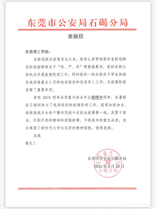 近日,我校收到一封来自东莞市公安局石碣分局的表扬信,通报表扬了我校2018级食品与安全专业、应化与食品学生第二党支部党员胡伟中同学。东莞市公安局石碣分局表扬了胡伟中在暑假实习期间参与了疫情防控工作,经常加班加点、连续奋战与全体干警共同战斗在抗击疫情第一线的先进事迹,表扬其勇于担当、尽职尽责的精神和顽强拼搏、不惧艰辛的意志品质,充分展现了新时代大学生良好的精神面貌。
