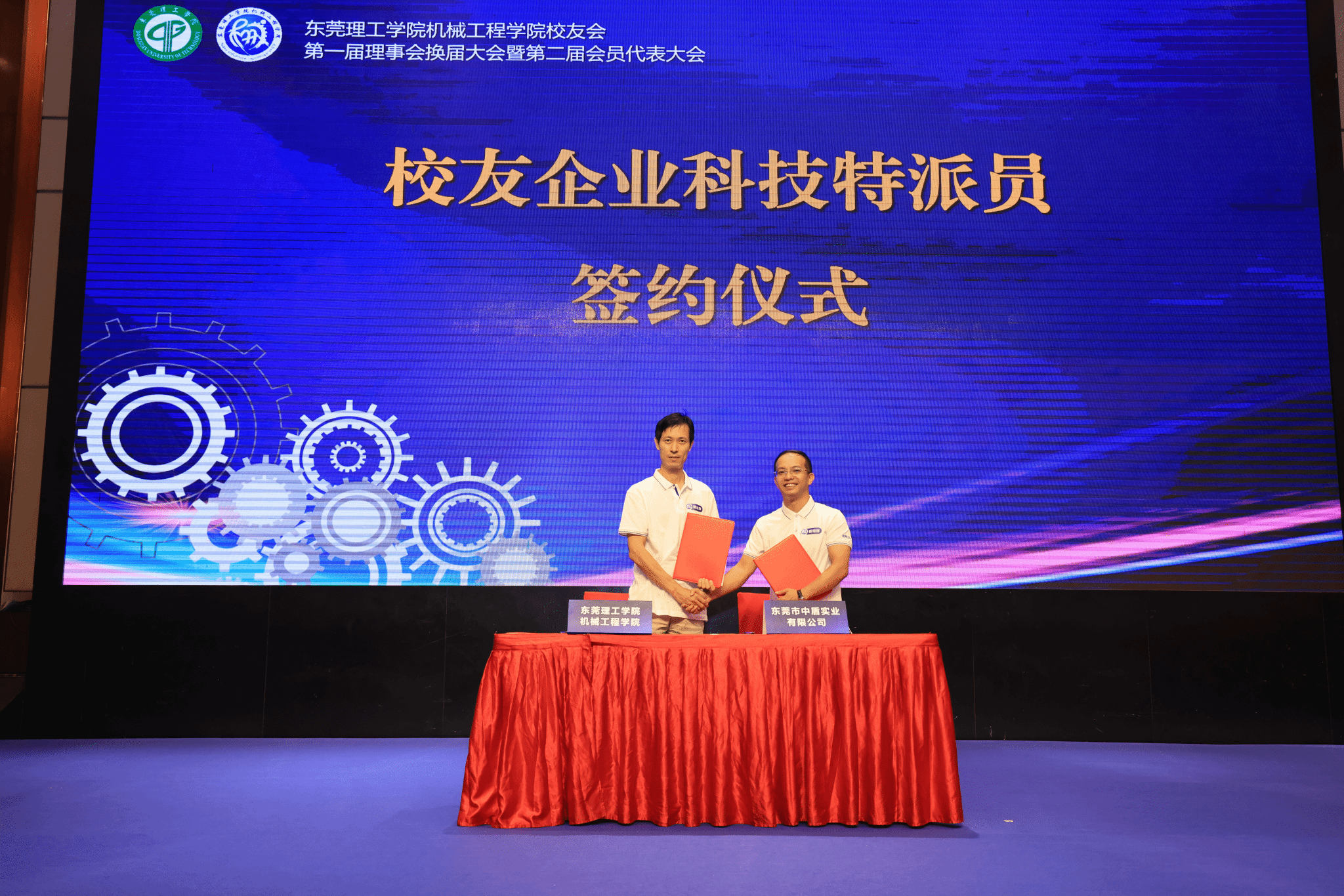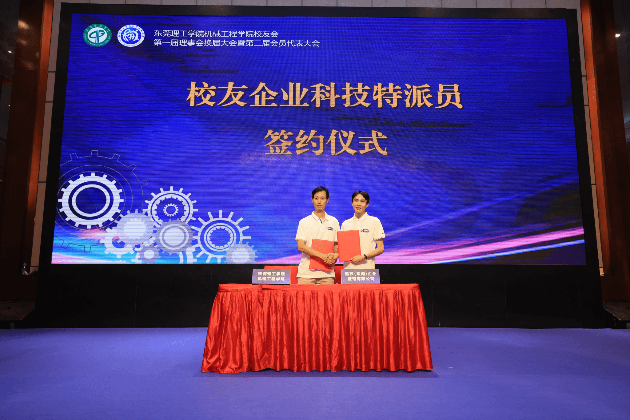 2010级工业设计专业校友、追梦(东莞)企业管理有限公司总经理许梓河,2004级工程管理专业校友、东莞市中盾实业有限公司总经理崔明辉代表校友企业与学院副院长曾达幸签订一博士一校友企业科技特派专员协议。进一步完善学院科技特派员服务支撑体系,提升科技特派员的组织效能和服务成效,切实提高科技服务水平和科技创新创业能力。