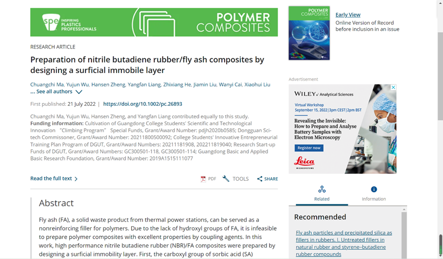 近日,材料科学与工程学院高性能橡塑实验室团队本科生马创池、吴昱均、郑瀚森、梁扬帆、刘嘉敏、蔡婉仪、刘晓惠等同学在学院副研究员杨树颜的指导下,在聚合物复合材料领域学术期刊《Polymer Composites》(CiteScore排名分区为Q1,IF=3.532)发表粉煤灰资源化利用研究最新成果《Preparation of nitrile butadiene rubber/fly ash composites by designing a surficial immobiles layer》。