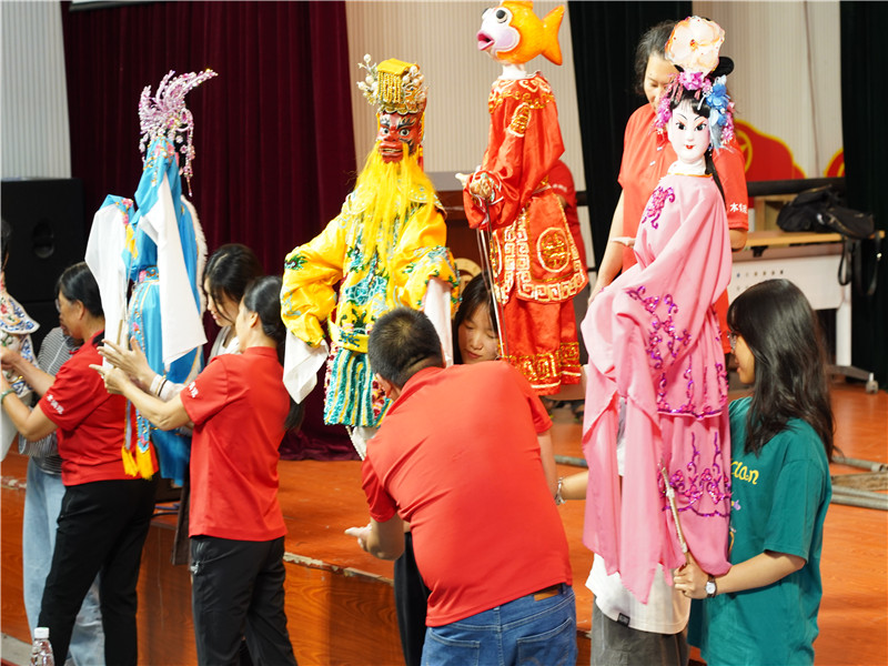 现场,剧团的老师们还邀请同学们学习木偶的操作。同学热情高涨,纷纷到前台跟着老师们学习。同学们耐心地听师傅们的讲解、认真地模仿起来。单是托举木偶戏,很快就有同学坚持不住。同学们表示,短短几分钟的体验就感受到传统艺人的坚持与辛苦,并对其精致、灵巧的制作技艺表示倾佩。