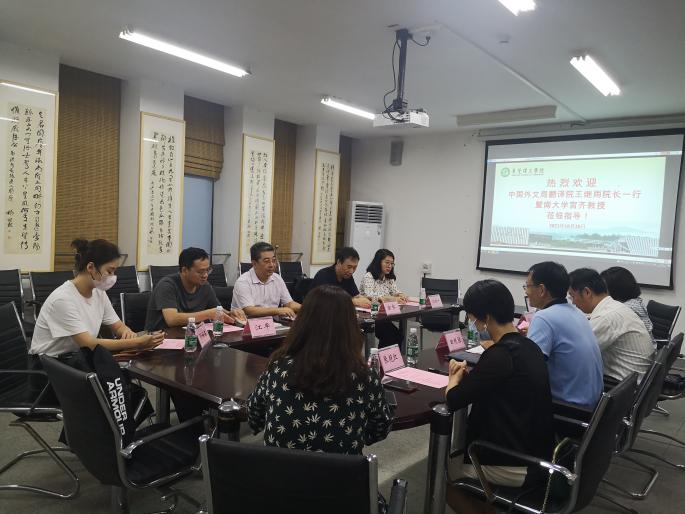 10月20日,中国外文局翻译院院长、CATTI项目中心董事长王继雨,全国翻译专业资格考试办秘书长,中国外文局CATTI项目中心主任江平,暨南大学外语学院原院长宫齐教授一行来我校参观调研,校长马宏伟、文传学院院长田根胜、教务处副处长许燕转以及相关负责人与来宾进行座谈。