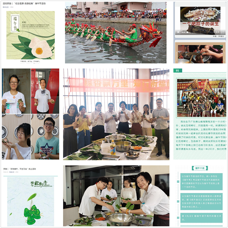 活动内容丰富,形式多样,既有包粽子送祝福、宿舍走访送关怀等线下活动,也有诵读经典文学、记录身边的端午习俗、传统文化知识小测试、端午节微视频征集等线上活动。其中,松山湖校区以“佳节临端午,粽子送祝福”“浓情端午,千古习俗”“纪念屈原,诵读经典”“浓情端午,粽情于你”“端午话习俗”为主题,莞城校区以“粽香飘万里,知行祈福荫”“端午事,端午情”“品味端午,传承文化”为主题。丰富的体验式活动,引导同学们更好地认识和理解端午节的文化习俗,自觉传承和弘扬中华优秀传统文化,提升文化认同感、自豪感,增强文化自信。