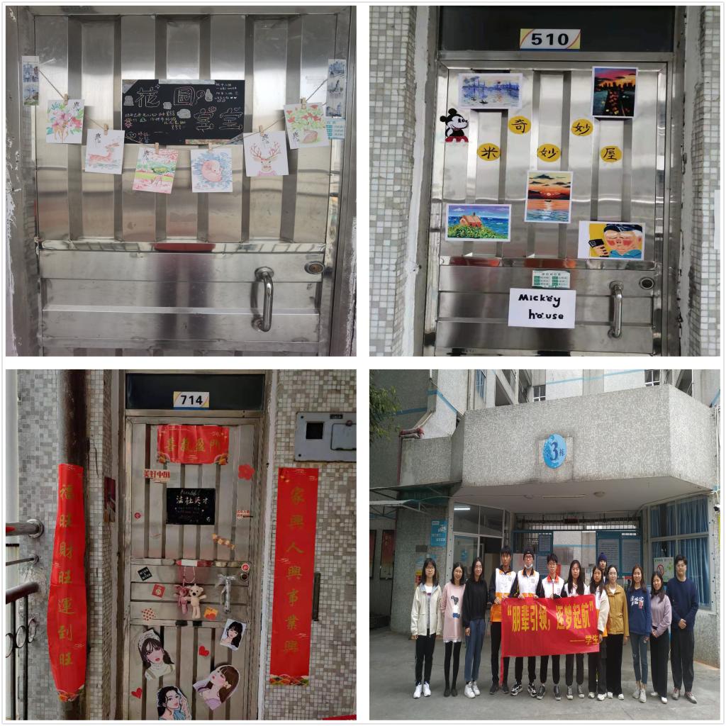 活动期间,莞思社区第3栋宿舍的学生认真细致清理宿舍走廊卫生,汇聚宿舍成员构想设计“家”名以及“家”门美化布置。12月10日下午,知行学院相关部门工作人员以及朋辈导生团队对89个宿舍进行评比。宿舍风格各有千秋,展现了不同的宿舍文化,展示了不同宿舍同学的文化功底、创意空间和动手能力。“家”门有粘贴富有节日文化氛围门联的,有利用小物件装饰品进行美化的,也有利用植物盆景点缀的,经过精心布置,宿舍楼温馨俨然,有如“小家”般的归属感。