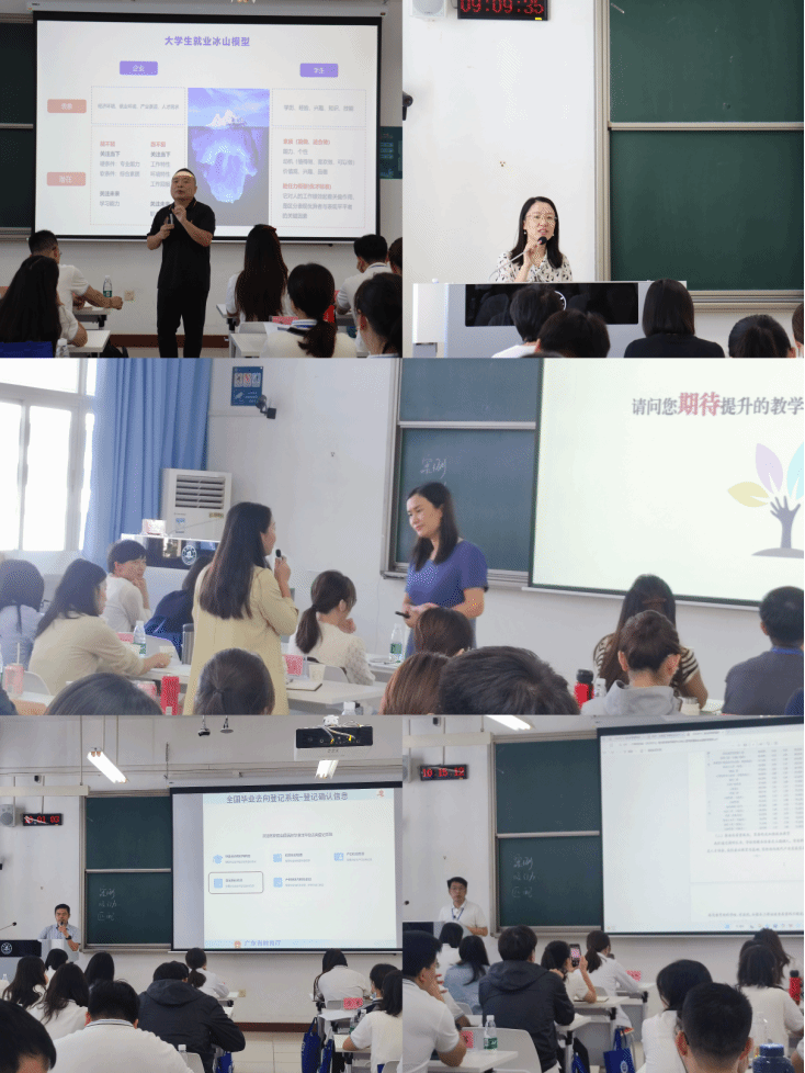 培训班邀请了广东省教育厅就业创业处麦军明老师,湾创智策董事长、共青团中央中国青年创新创业导师、教育部高校毕业生就业创业指导委员会委员苏登光,暨南大学学生就业指导中心生涯发展教育与咨询部部长、GCDF全球职业规划师曹玲莎,全球职业规划师(GCDF)、全球生涯教练(BCC)、国家二级心理咨询师、职业指导师理论教学中范梦等多位就业工作知名专家学者授课。授课内容包括全国高校就业形势分析及应对策略、大学生生涯教育体系建设的探索和实践(以暨南大学学生就业工作为例)、高校就业指导课程教学能力提升、广东省大学生就业创业小程序就业事务办理的操作指导等内容。就业创业服务科徐斌老师结合学生高频次反馈的意见和建议,交流分享了学校日常就业工作事务办理的规范化流程和注意事项。培训班两位学习小组组长王谦和雷菲老师代表做了小组总结。课后,授课专家与学员进行了热烈的探讨。