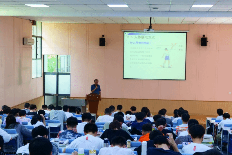 在“树立安全意识、安全用电培训”专题讲座上,电智学院王彩申老师进行安全用电科普,强调用电安全的重要性,为学生科普实验室的潜在安全隐患和救急方法。