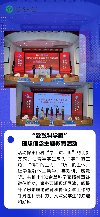 创新手段,提高党史学习教育实效。大学生艺术党课、“强国有我”红色情景剧比赛、致敬科学家主题教育活动等项目,立足于大学生群体特点,创新活动形式,采用文艺表演、自编剧目、演说结合等手段,再现革命历史、展现人物风华、普及科学家精神,促进党史学习教育有声有色、入脑入心。刚刚转为正式党员的学生艺术团团长、2020级机械设计1班黄子洋表示,参加艺术党课的策划组织与录制是一件非常有意义的实践,很好地诠释了党课的主题“青春心向党,红色映初心”。