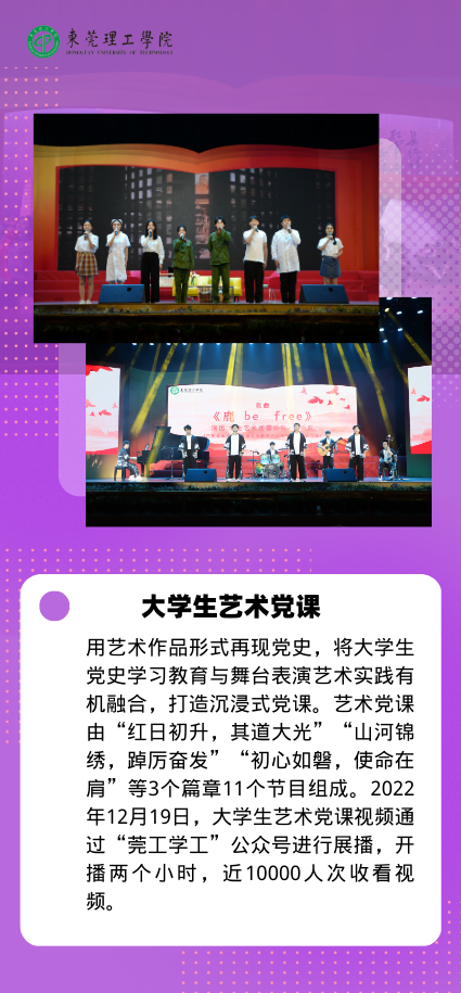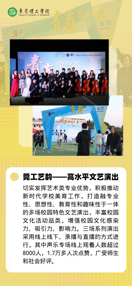 以美育人,拓展艺术教育阵地。“莞工艺韵”系列文艺演出2022年度完成了3个专场的策划、组织与实施,向全校师生和社会各界展示莞工文艺的水准和品位。