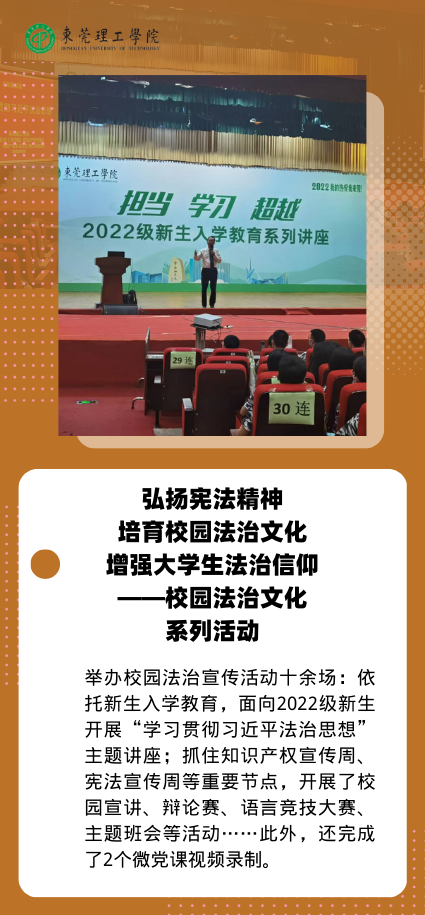 此外,弘扬宪法精神、“绿色低碳‘莞’未来”等文化品牌项目,也结合实际,开展了形式多样的活动,不断丰富校园文化内涵。