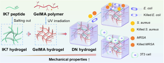 开发具有高机械性能和抗菌功效的双网络(DN)水凝胶以对抗多重耐药细菌感染并作为细胞培养支架仍存在挑战。该工作利用离子响应的抗菌肽(C16-WIIIKKK,简称IK7)与光响应的甲基丙烯酰化明胶(GelMA)协同构建了具有良好生物相容性的DN水凝胶,其显示出增强的机械性能与显著的抗菌功效。通过可控与持续释放IK7肽,DN水凝胶可有效抑制靶向细菌的生长。此外,DN水凝胶的形成可保护IK7肽免受蛋白酶K的快速降解。GelMA-IK7 DN水凝胶在下一代抗菌水凝胶中具有巨大潜力,并有望用于三维细胞培养和组织再生。