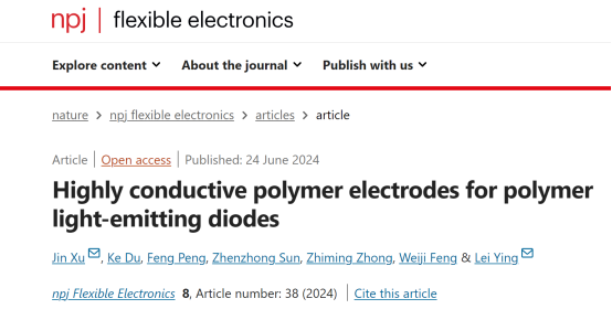 近日,我校机械工程学院徐进副研究员团队在柔性电子领域国际顶级期刊、Nature旗下期刊《npj Flexible Electronics》上发表了题为“Highly Conductive Polymer Electrodes for Polymer Light-Emitting Diodes”的研究论文。该成果以九九精品视频一区在线久久久久久久久久毛片精品美女|国产99久久久久久免费看|中文精品99久久国产|国产69精品久久久久9999|精品久久久久久中文字幕无码|亚洲熟妇无码久久精品国产精品99|精品国产天堂综合一区在线机械工程学院为第一署名单位,徐进副研究员为第一作者及通讯作者,华南理工大学应磊教授为共同通讯作者,机械工程学院研究生杜珂为共同第一作者,机械工程学院孙振忠教授与钟知鸣副研究员为论文提供指导并署名,是我校在柔性电子领域的一大突破,研究得到国家自然科学基金等项目资助。